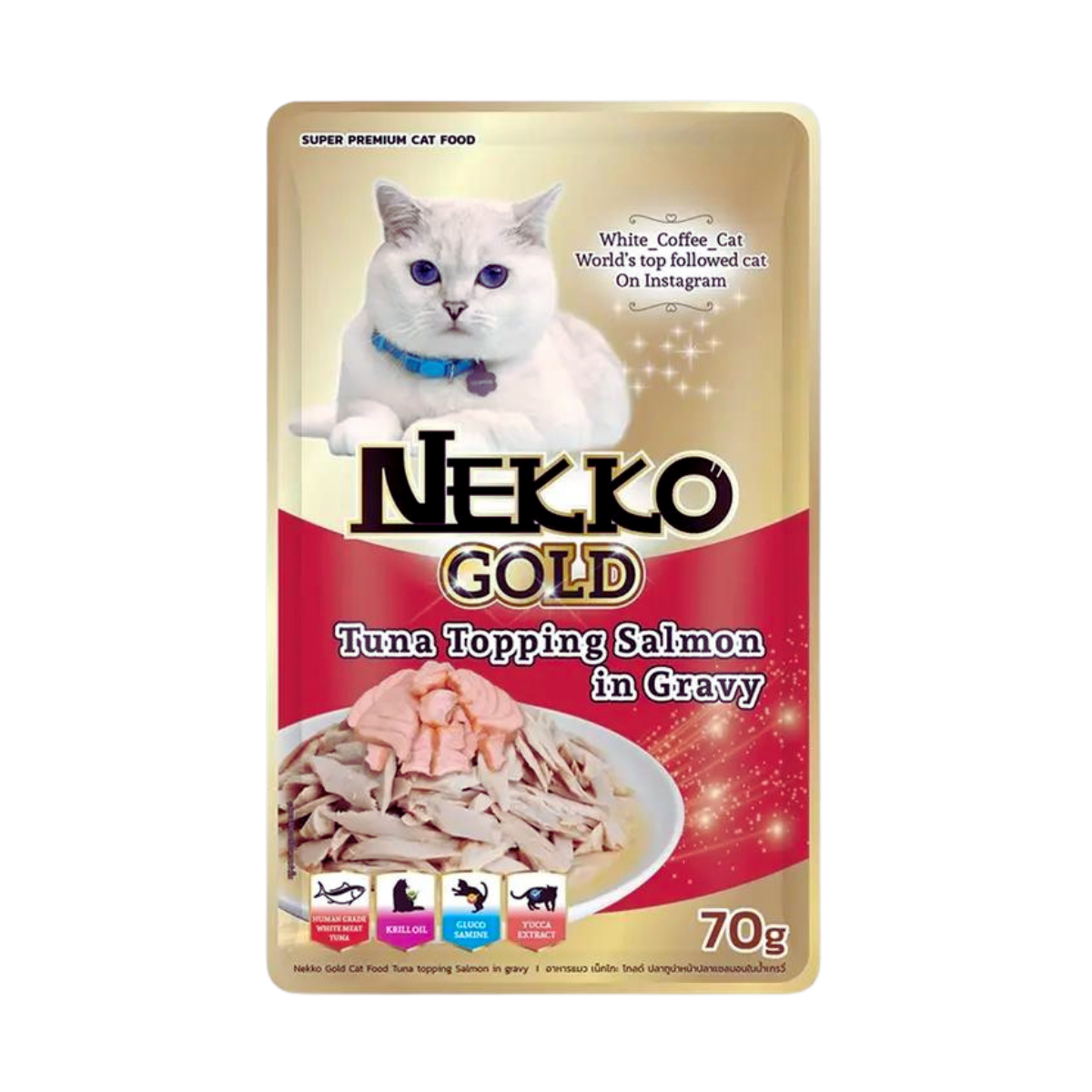 The Nekko Gold Pouch Tuna Topping Salmon Gravy is a great option for a nutritious and delectable supper that satisfies your cat’s appetite.