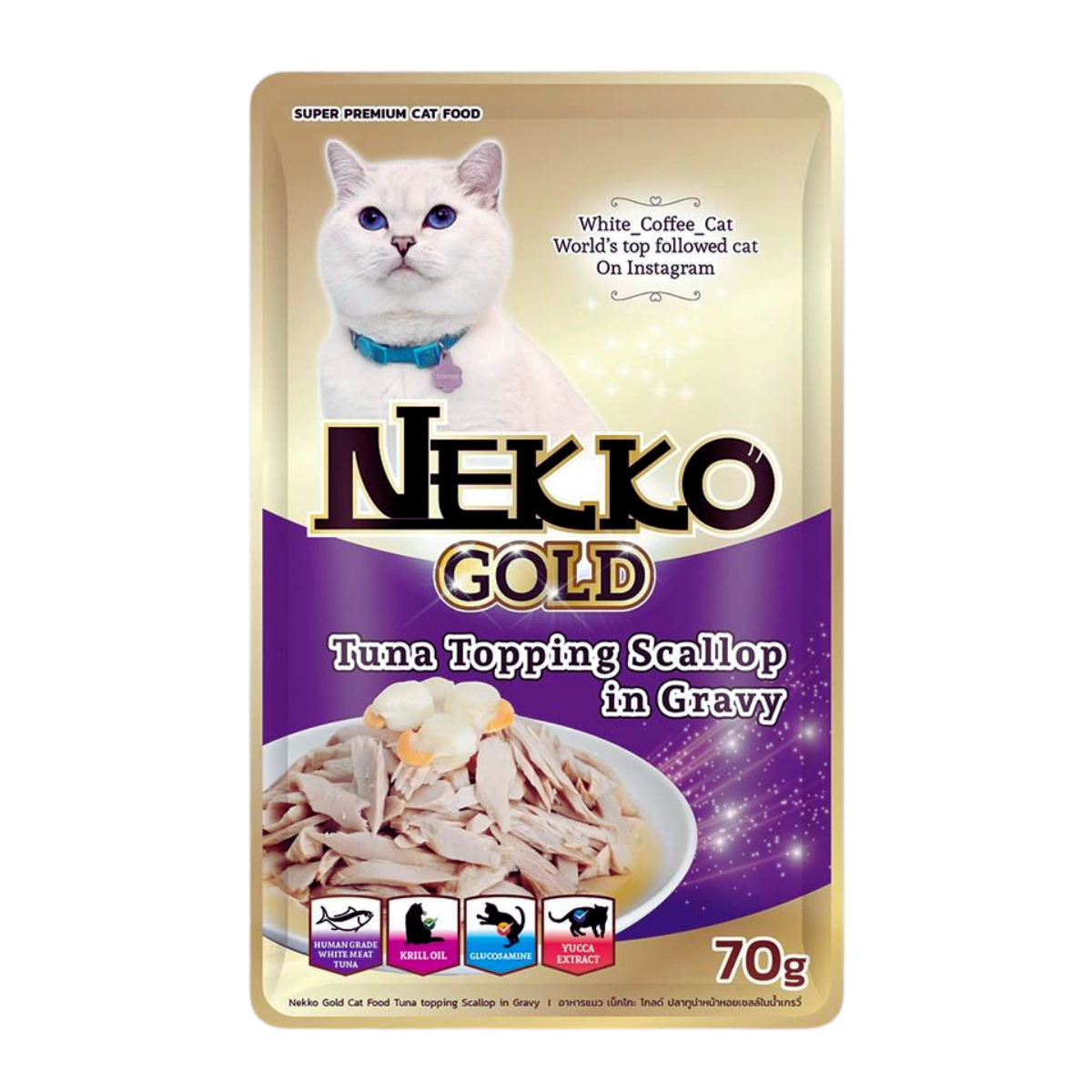 Give your cat a tasty and nourishing supper with Nekko Gold Pouch Tuna Topping Scallop in Gravy!