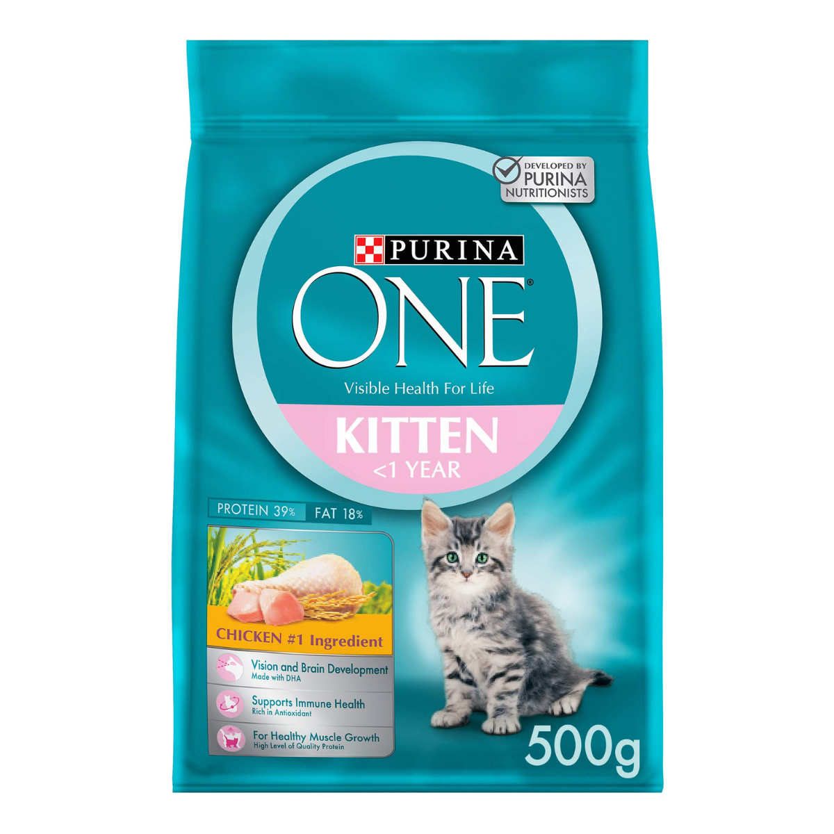 The 500g bag of Purina ONE Kitten Food with Chicken is especially designed to fulfill the specialized dietary requirements of developing kittens. This premium cuisine, which has premium chicken as its major ingredient, is packed with necessary proteins that support healthy development and strong muscles. Rich in essential nutrients such as DHA derived from fish oil, this food aids in the development of your kitten’s brain and vision during its critical early growth stage.