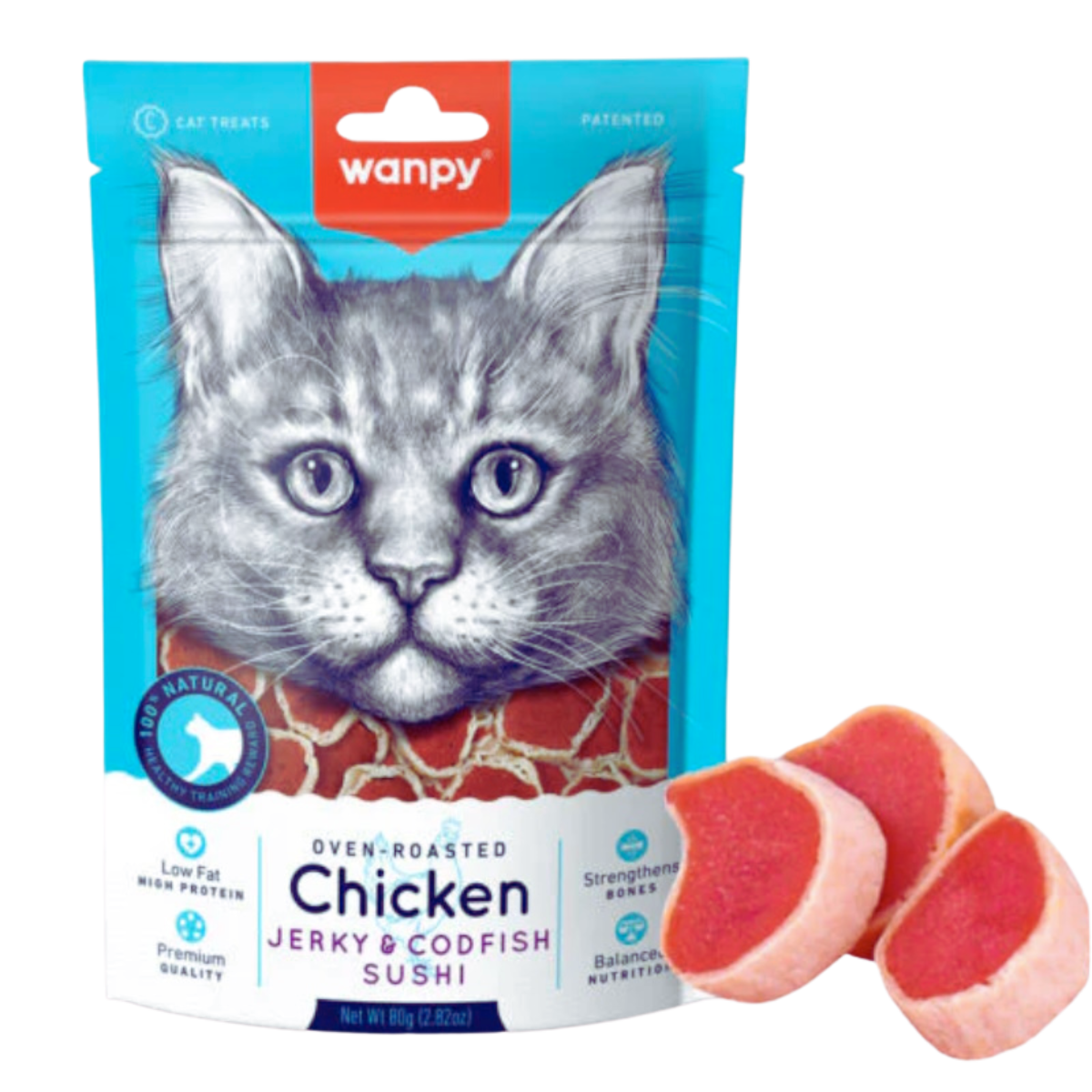 Wanpy Oven Roasted Chicken Jerky and Cod Fish Sushi, you can give your cat a taste of both the farm and the ocean—the ideal gift for picky eaters!s